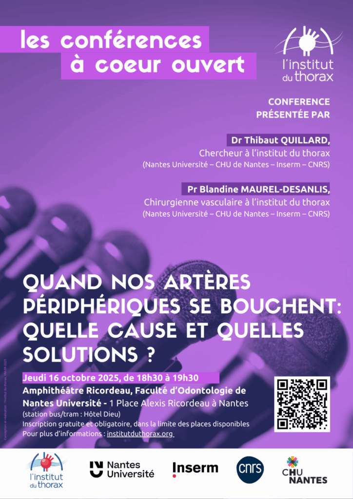 Télécharger le communiqué de presseNantes, le 7 octobre 2025 – Pour la 2e année consécutive, l’institut du thorax (Nantes Université, Inserm, CNRS, CHU de Nantes) propose un cycle de « Conférences à cœur ouvert », dédiées au grand public. Lors de cette conférence, les experts médicaux et scientifiques de l’institut du thorax feront le point sur leurs avancées dans la prise en charge, la compréhension et la prévention de l’athérosclérose. Cette conférence se tiendra le jeudi 16 octobre 2025 à 18h30, à la Faculté d’odontologie de Nantes Université.
